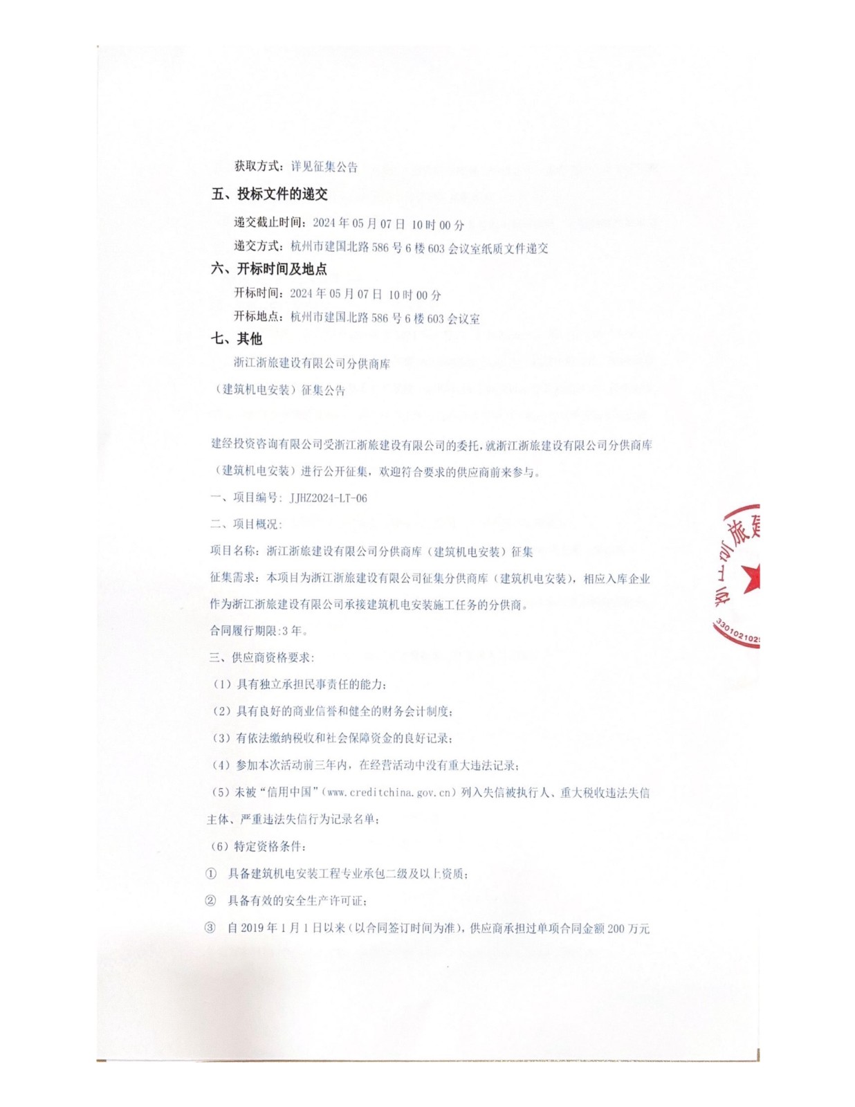 浙江浙旅建設有限公司分供商庫(建筑機電安裝)征集公告
