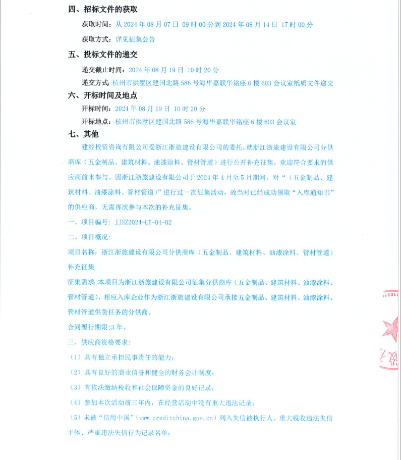 浙江浙旅建設(shè)有限公司分供商庫(kù)(五金制品、建筑材料、油漆涂料、管材管道)補(bǔ)充征集公告