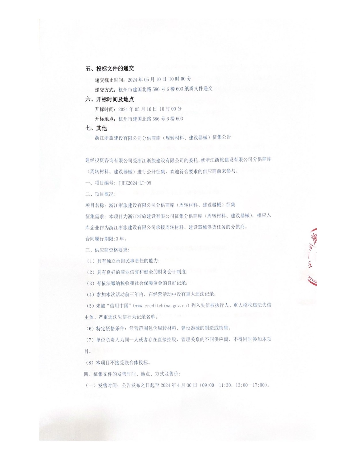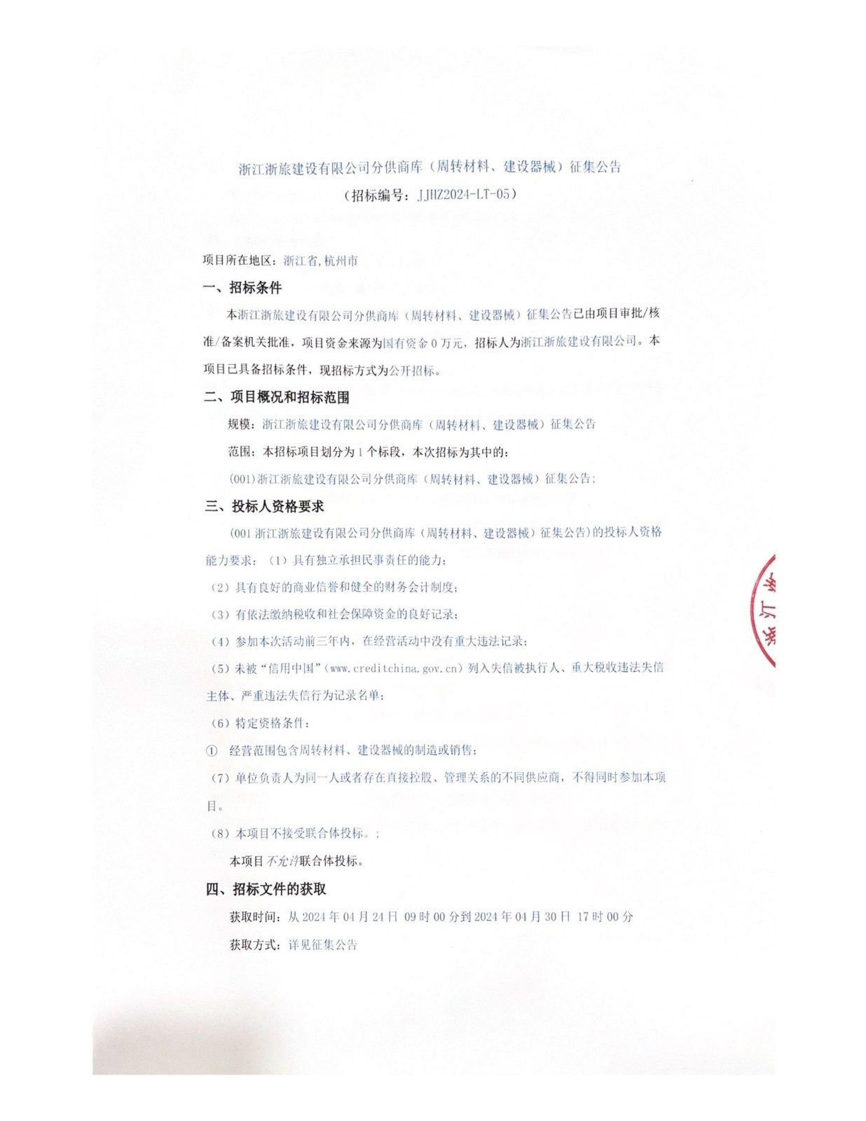 浙江浙旅建設(shè)有限公司分供商庫(kù)(周轉(zhuǎn)材料、建設(shè)器械)征集公告